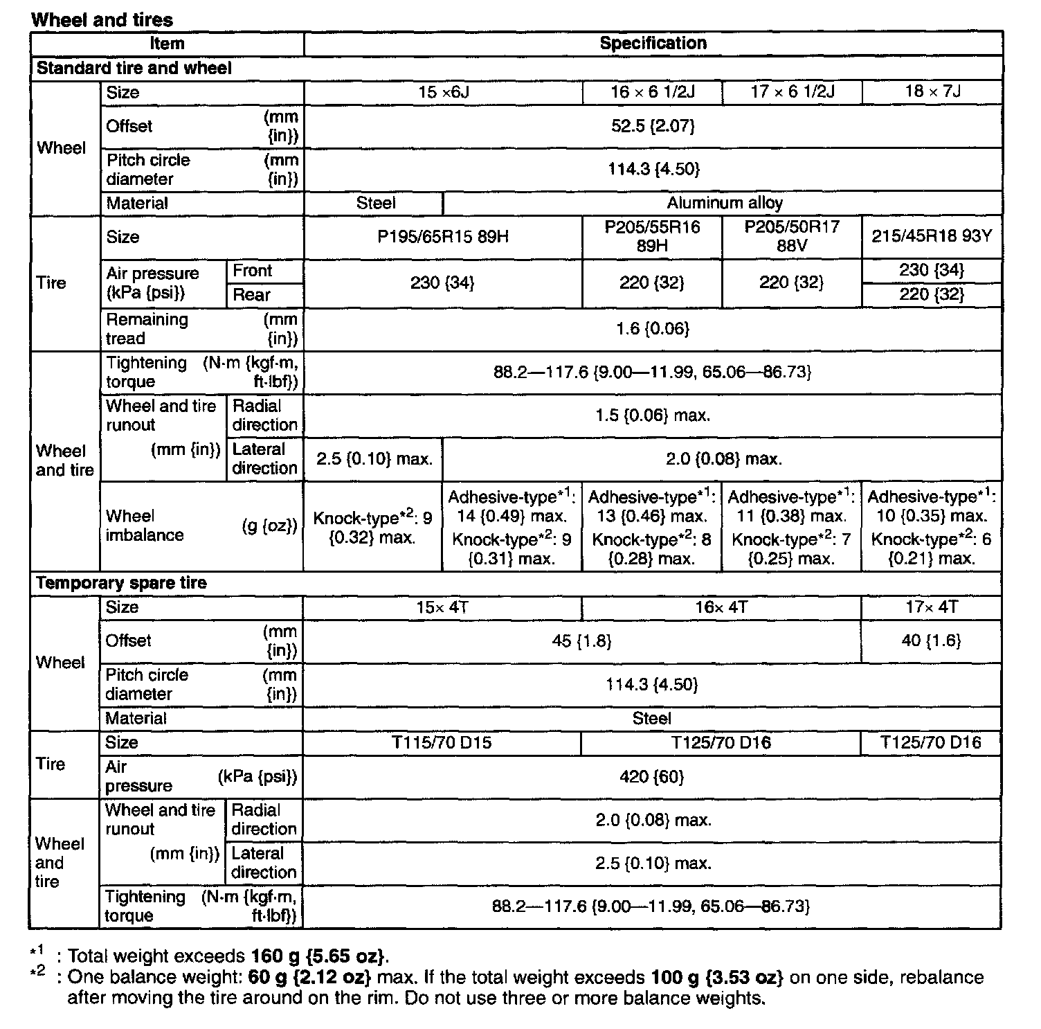 WHEEL AND TIRE SPECIFICATION