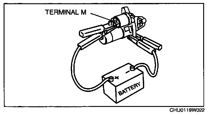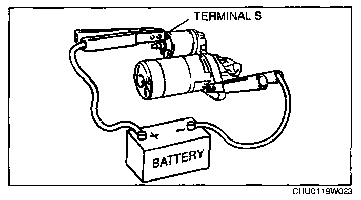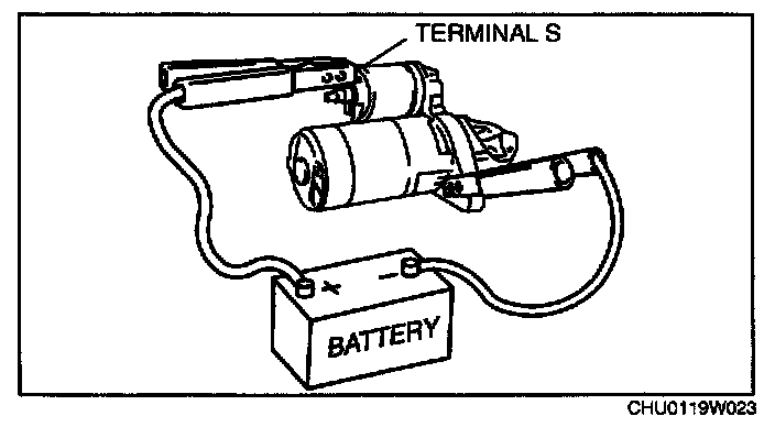 1. Verify that the starter motor pinion is extended while battery positive voltage is connected to terminal S and the starter body is grounded.