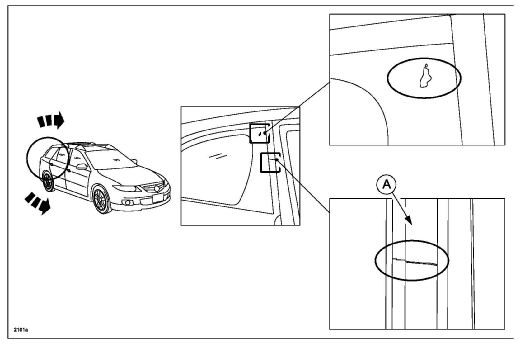 During rear quarter glass replacement, do not allow primer to enter between the rear quarter glass and garnish (molding)(A), otherwise cracks may appear on the garnish and/or the parts may adhere to each other. If heat is applied, the garnish may crack or black ceramic paint can peel due to a difference in shrinkage ratio.