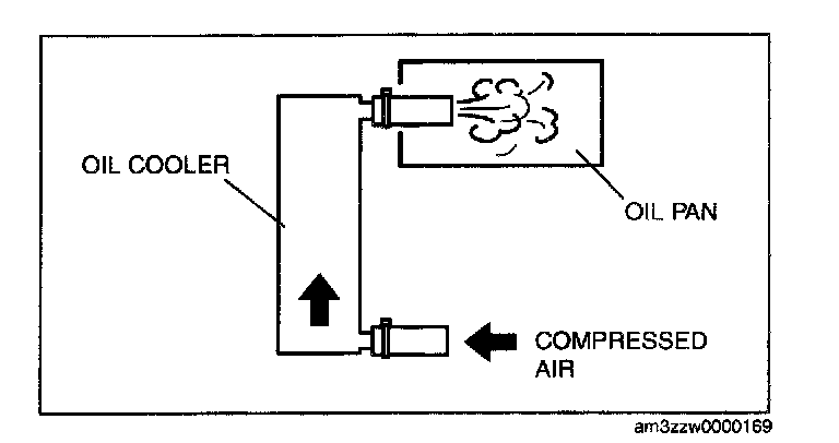 3. Blow 491 - 882 kPa (5 - 9 kgf/cm2, 72 - 127 psi) of compressed air from the oil cooler hose outlet to drain remaining oil.