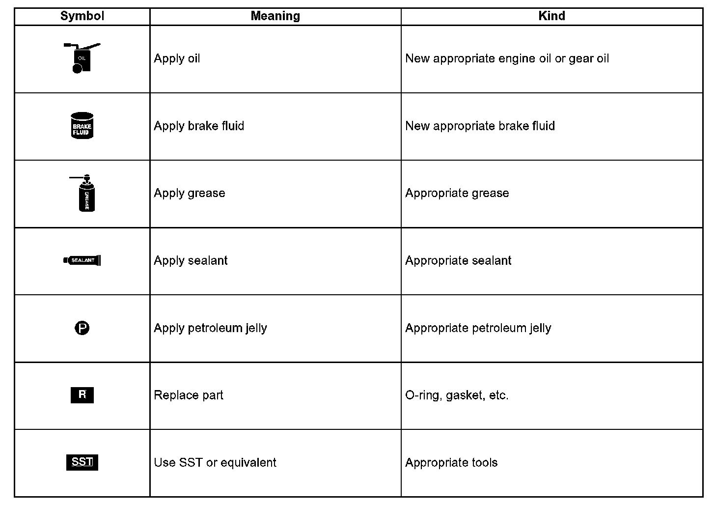 There are eight symbols indicating oil, grease, fluids, sealant, and the use of SST or equivalent. These symbols show application points or use of these materials during service.