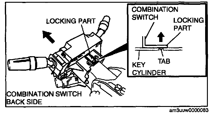 1. Pull the combination switch locks in the direction indicated in the figure and disengage the tab.