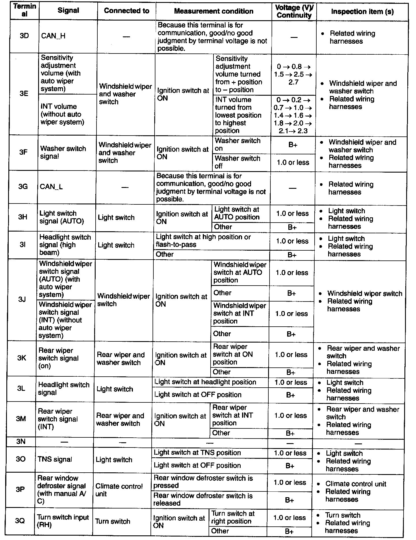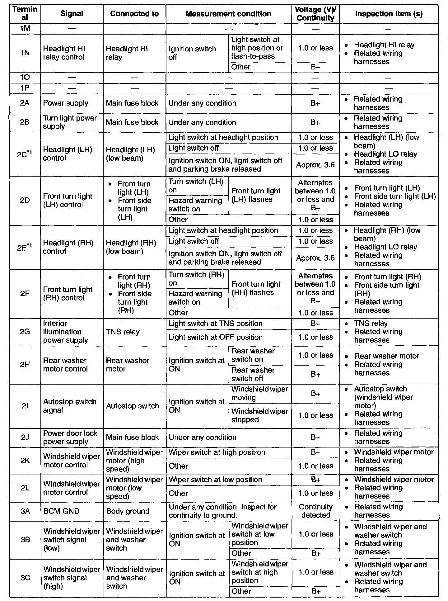 - If the voltage or continuity is not as specified in the Terminal Voltage Table (Reference), inspect the parts under "Inspection item (s)".