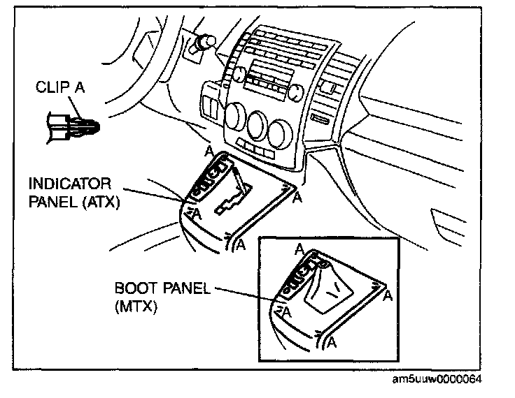 5. Pull the indicator panel (ATX), boot panel (MTX) upward and detach clips A.