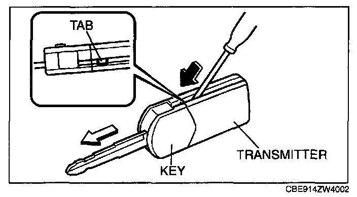 1. Insert a small screwdriver into the slot and push the tab to remove the key from the transmitter.