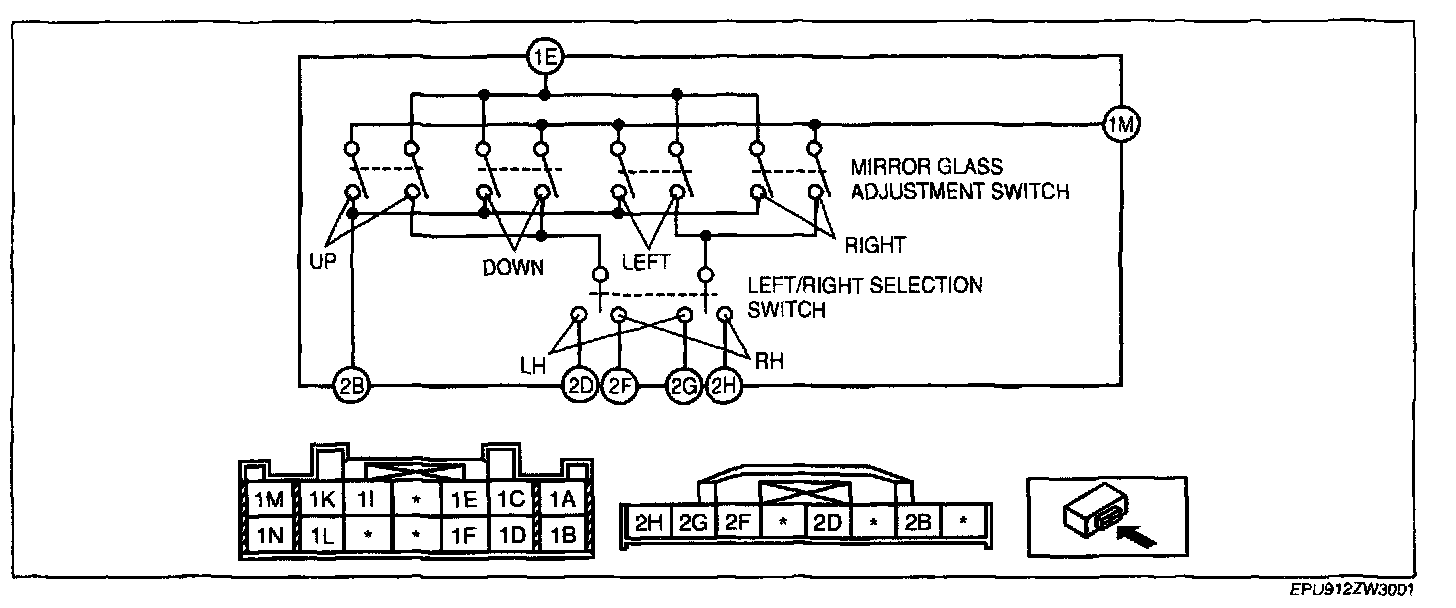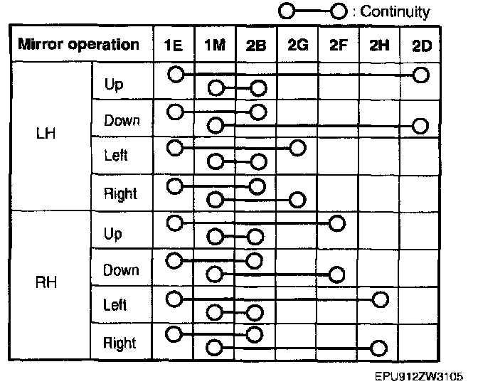 Inspect for continuity between the power outer mirror switch terminals using an ohmmeter.