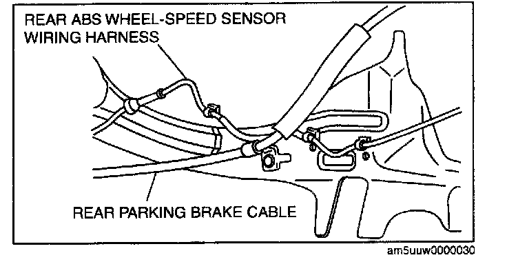 1. Pass the rear ABS wheel-speed sensor wiring harness outside the rear parking brake cable as shown in the figure.