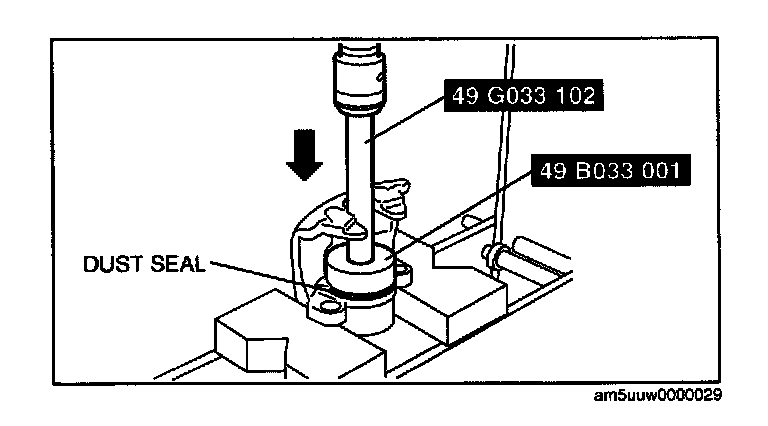 1. Assemble a new dust seal to the caliper using the SSTs and a press with a press-in force of 834 N (85 kgf, 187 in. lbf).