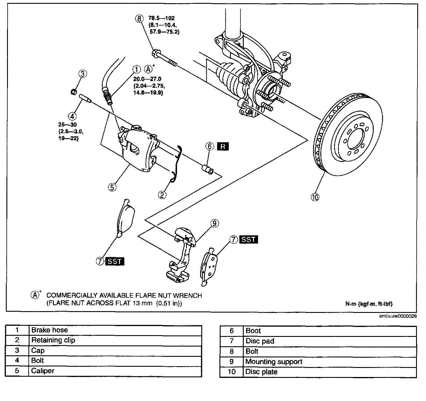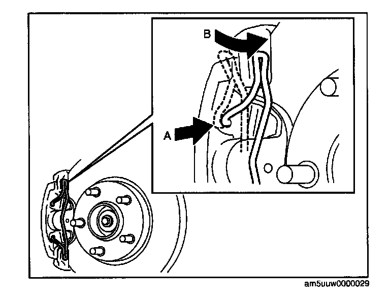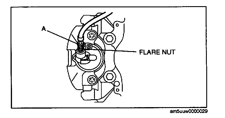 2. Tighten the flare nut while holding the brake hose at point A with a spanner or equivalent.