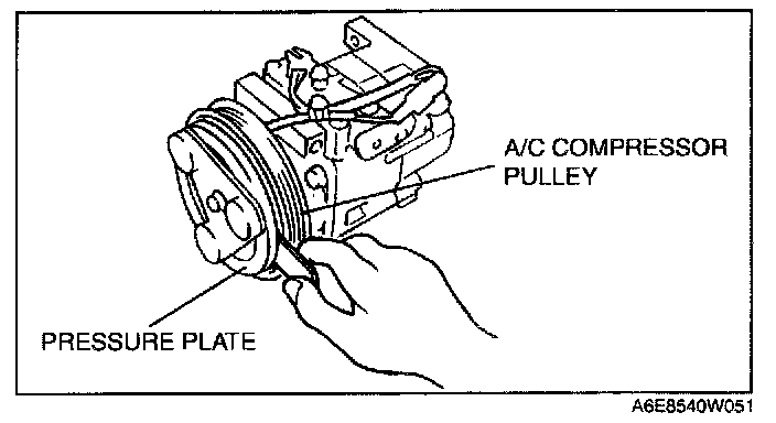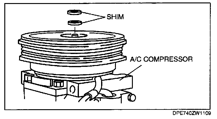 MAGNETIC CLUTCH ADJUSTMENT1. Measure the clearance around the entire circumference between the pressure plate and A/C compressor pulley using a thickness gauge.