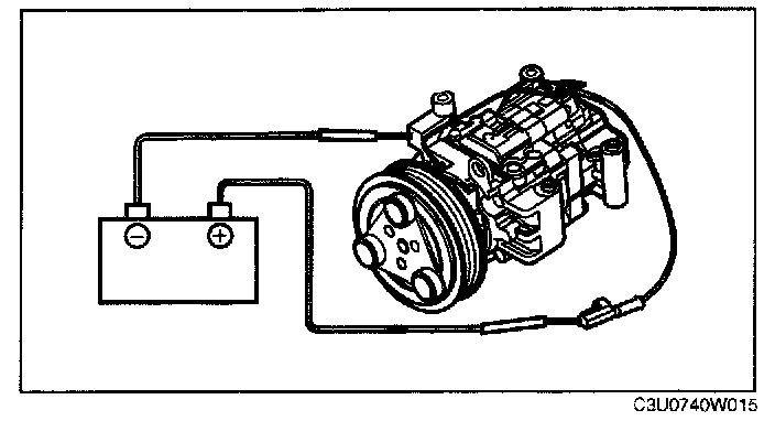 MAGNETIC CLUTCH INSPECTION1. Connect battery positive voltage to magnetic clutch terminal A and the A/C compressor body to ground.