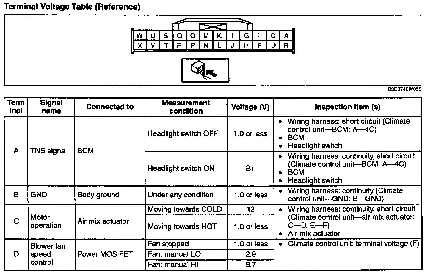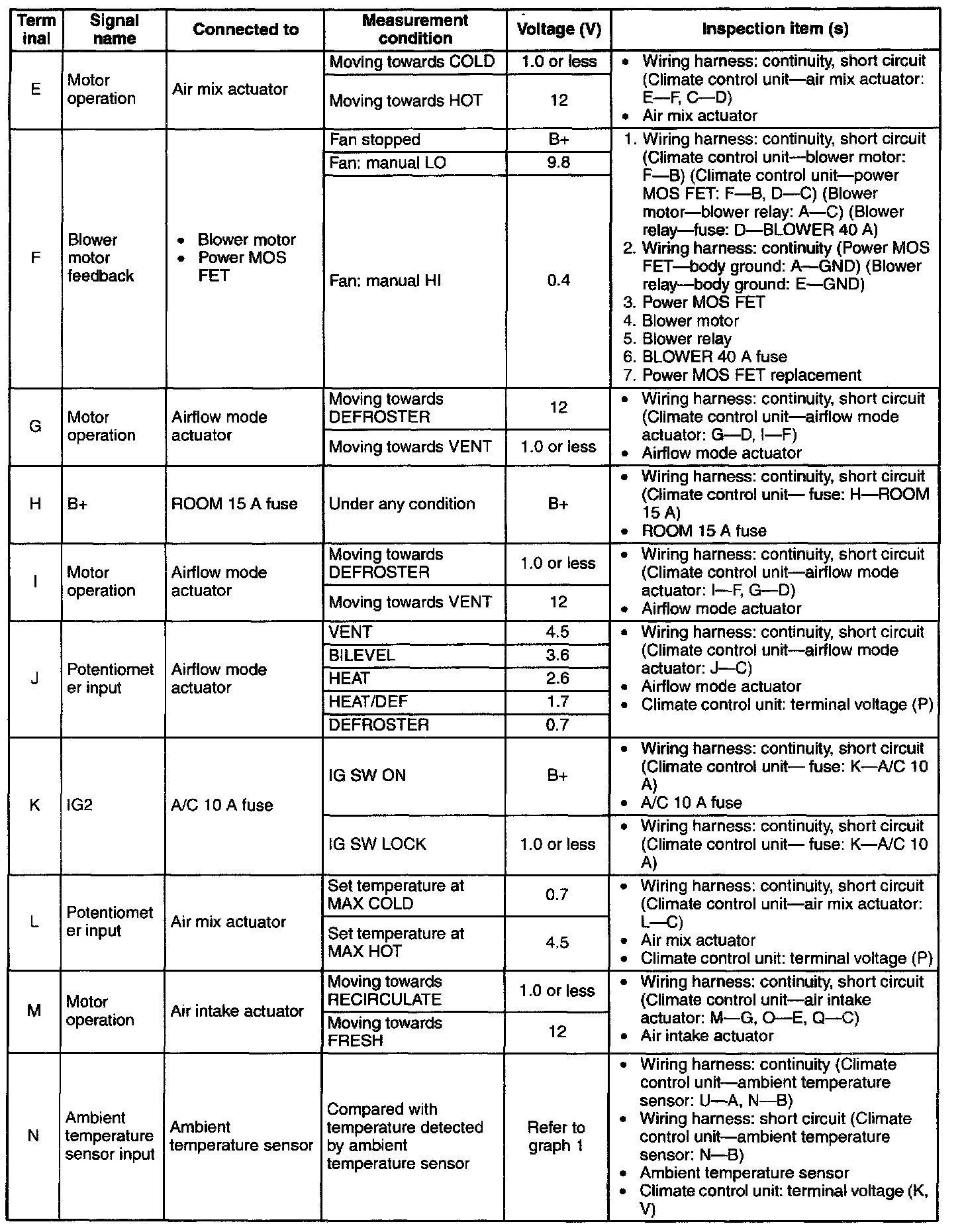 - For terminal F first try replacing the power MOS FET. If there is still any malfunction, replace the climate control unit.