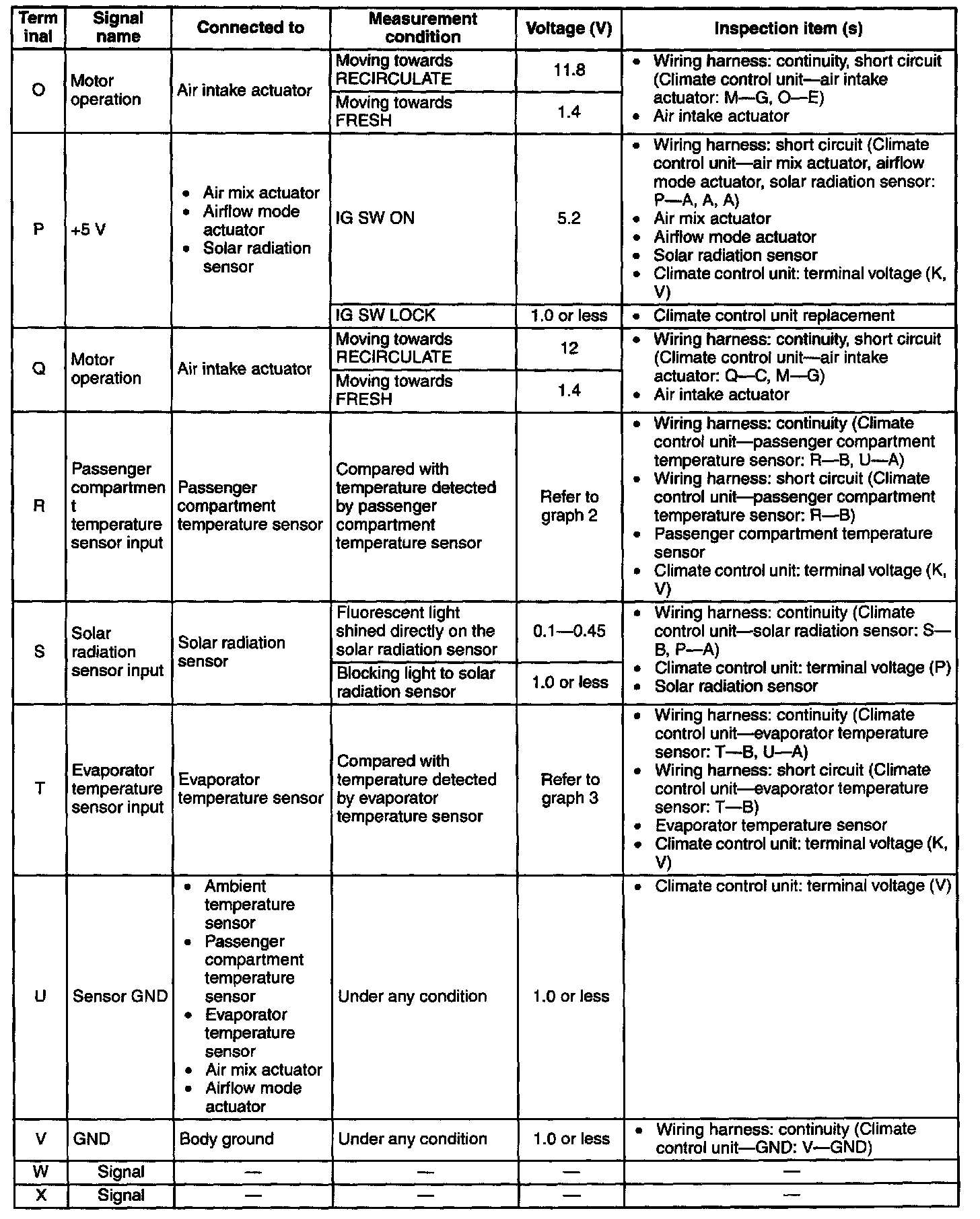 - If the parts under "Inspection item (s)" are found to be normal (except for terminal F), replace the climate control unit.