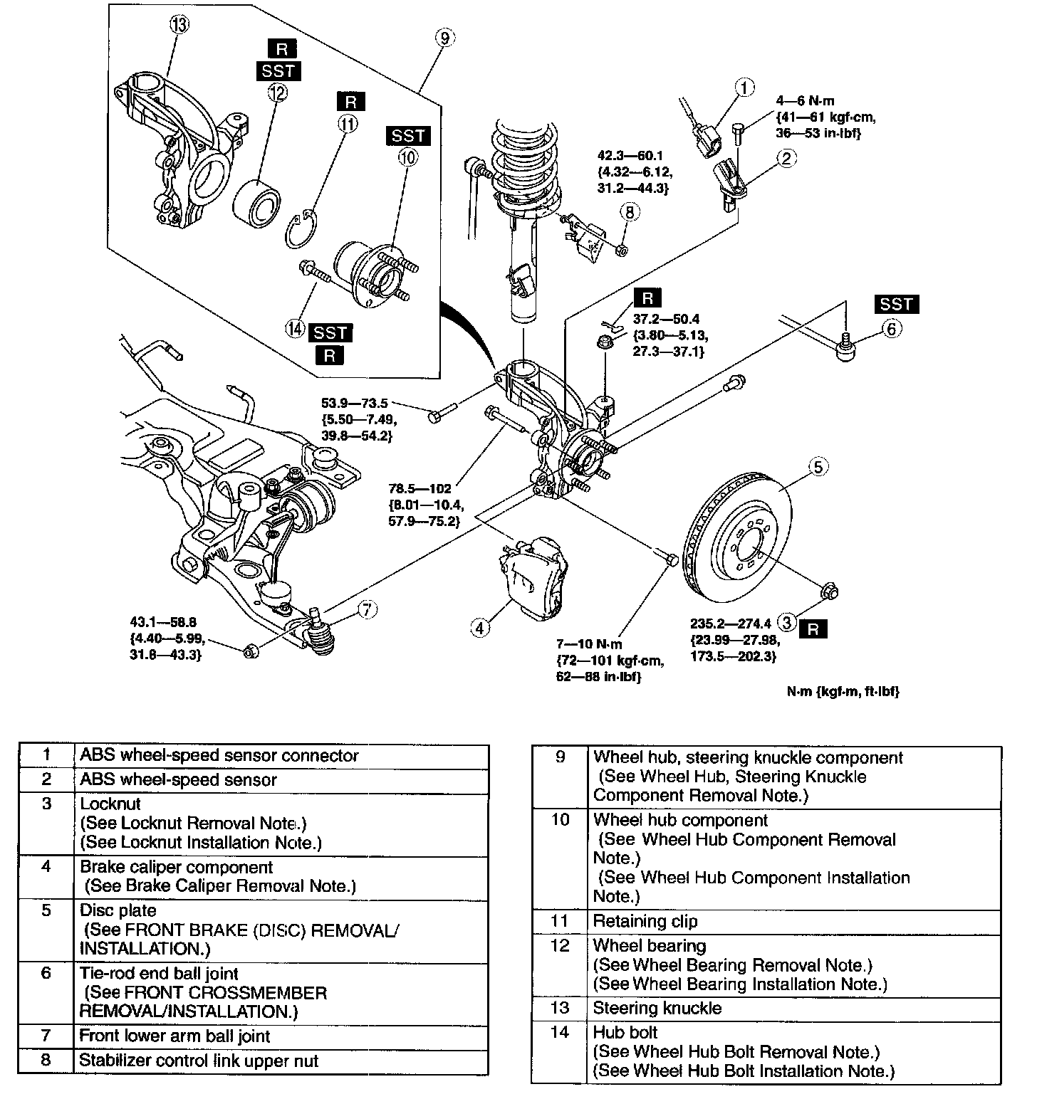 WHEEL HUB, STEERING KNUCKLE REMOVAL/INSTALLATIONCaution: Performing the following procedures without first removing the ABS wheel-speed sensor may possibly cause an open circuit in the wiring harness If it Is pulled by mistake. Before performing the following procedures, disconnect the ABS wheel-speed sensor connector (axle side) and fix the wiring harness to an appropriate place where it will not be pulled by mistake while servicing the vehicle.