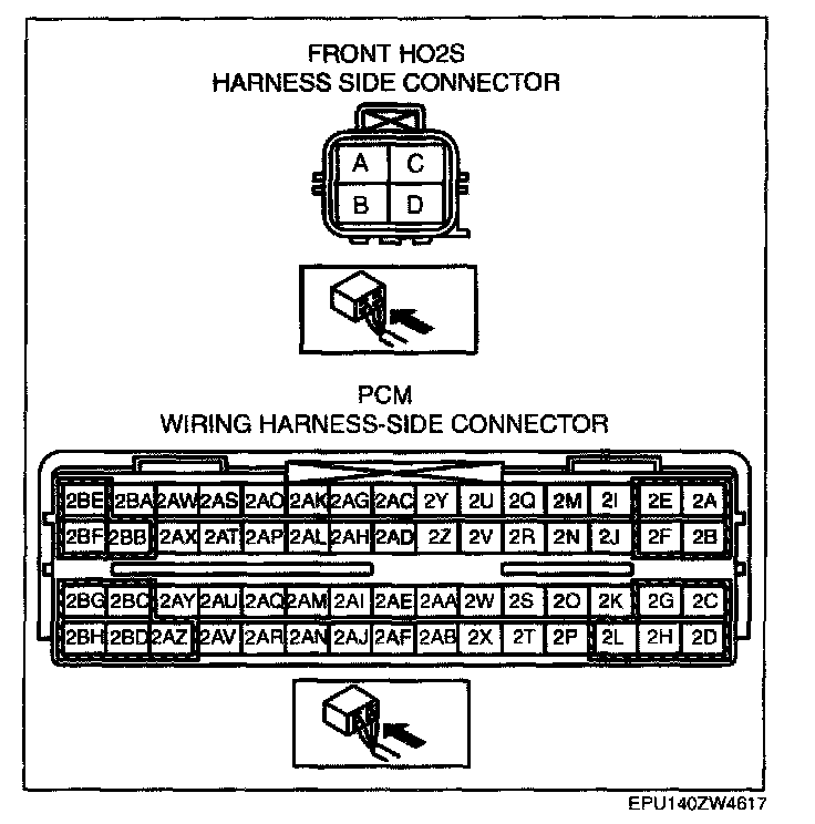 FRONT HEATED OXYGEN SENSOR (HO2S) INSPECTION[L3]NOTE: Before performing the following inspection, make sure to follow the procedure as indicated in the troubleshooting flowchart.