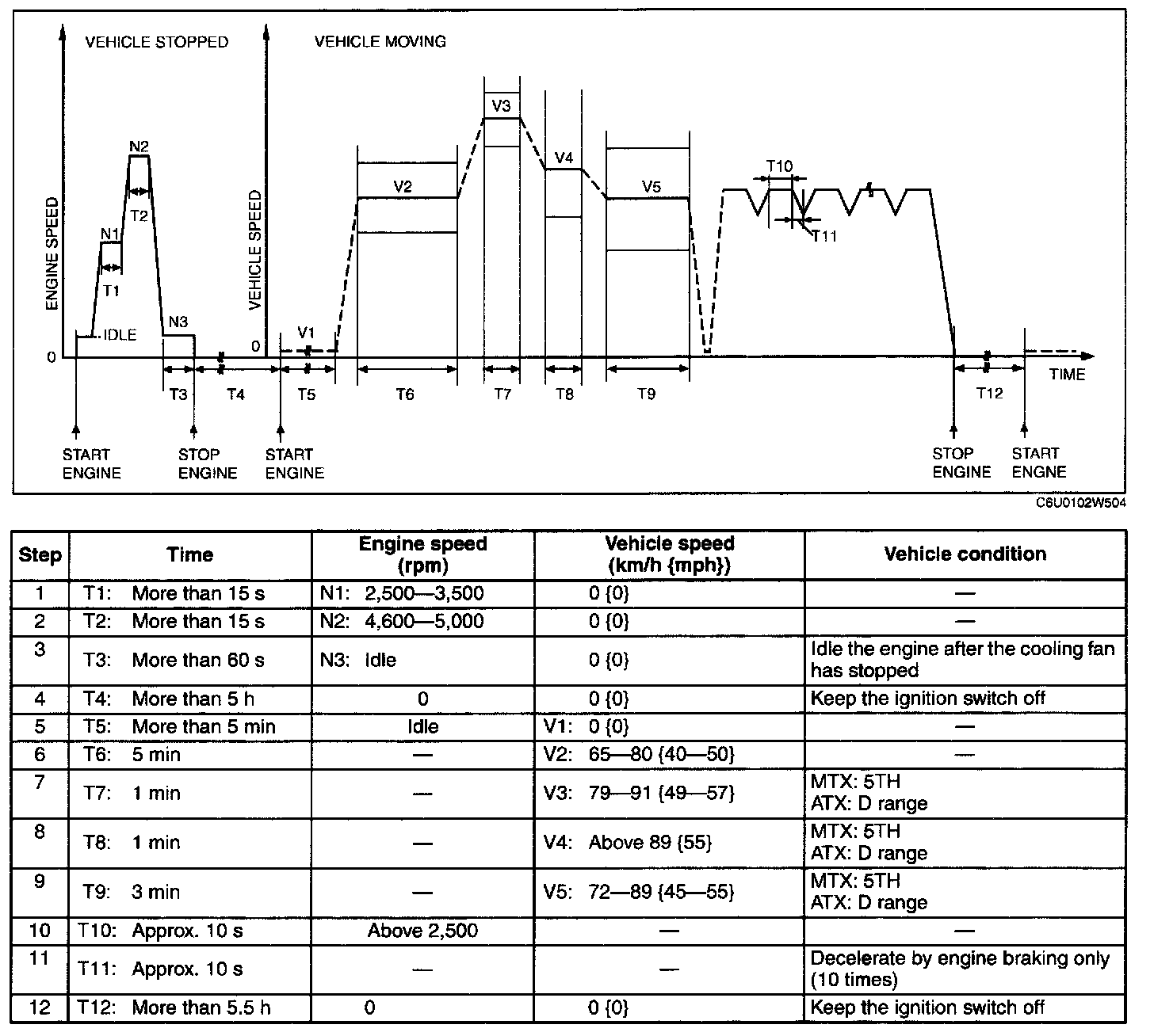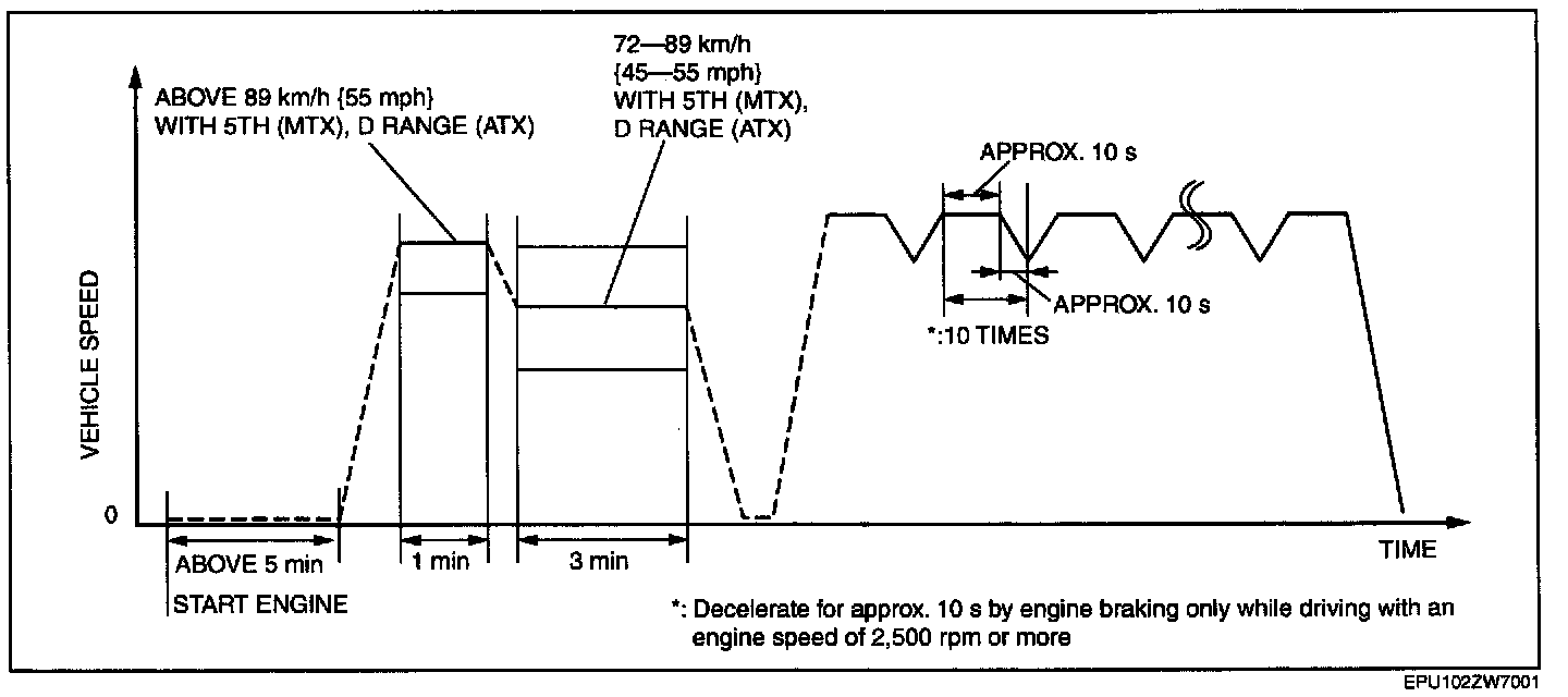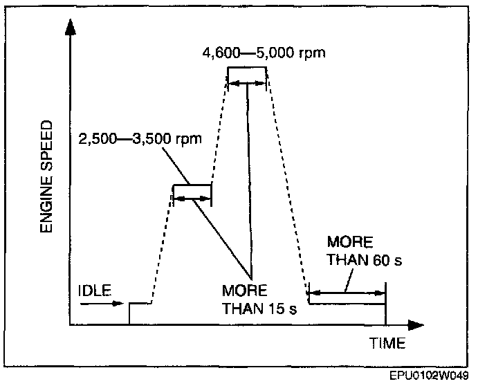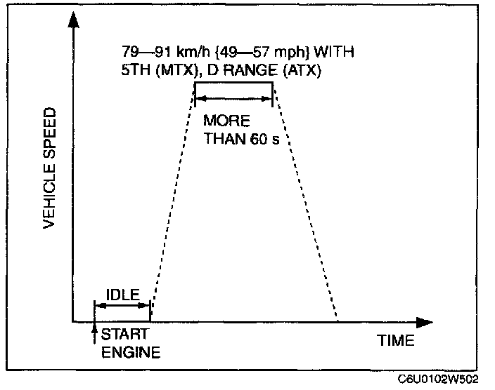 6. Drive the vehicle at an engine speed of 65-80 km/h {40-50 mph} for more than 5 mm.