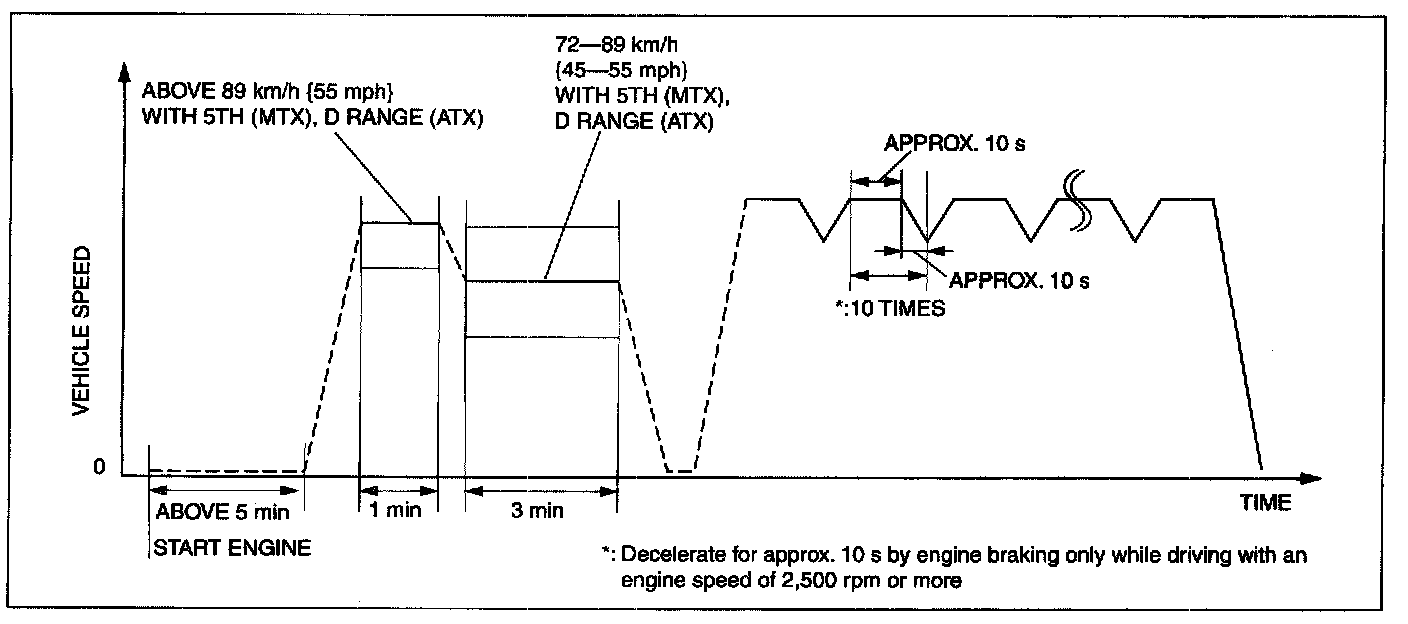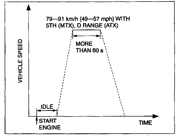 6. Drive the vehicle at an engine speed of 65-80 km/h [40-50 mph] for more than 5 minutes.
