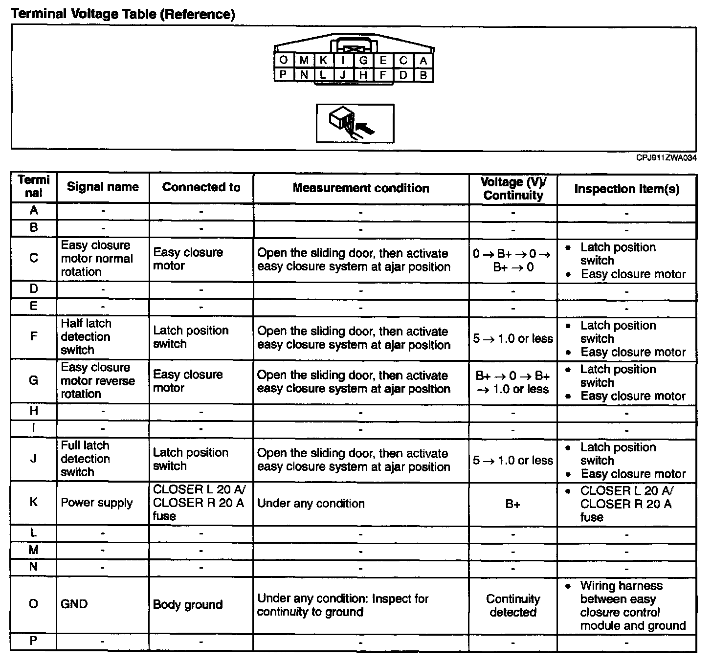 2. Before inspecting terminal for continuity, disconnect the easy closure control module connector.