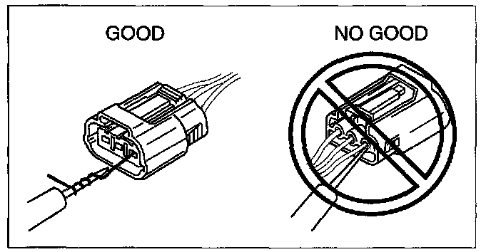 - When a tester is used to inspect for continuity or measuring voltage, insert the tester probe from the wiring harness side.
