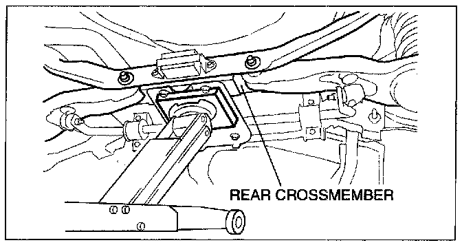 CAUTION: Place a board (approx. 20 mm (0.78 in) thick) between the rear crossmember and the jack to prevent damage to the crossmember.