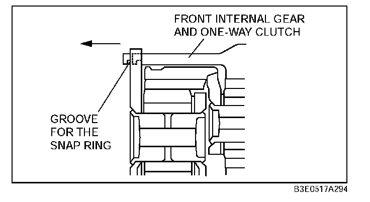 Note: Rotate the engine stand so that the oil pan faces downward. Pull the front internal gear and one-way clutch component a little until the groove for the snap ring appears, then install the snap ring.