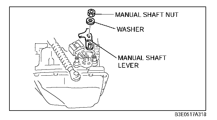 Caution: Do not use an impact wrench. Hold the manual shaft lever when removing the manual shaft nut, or the transaxle may be damaged.