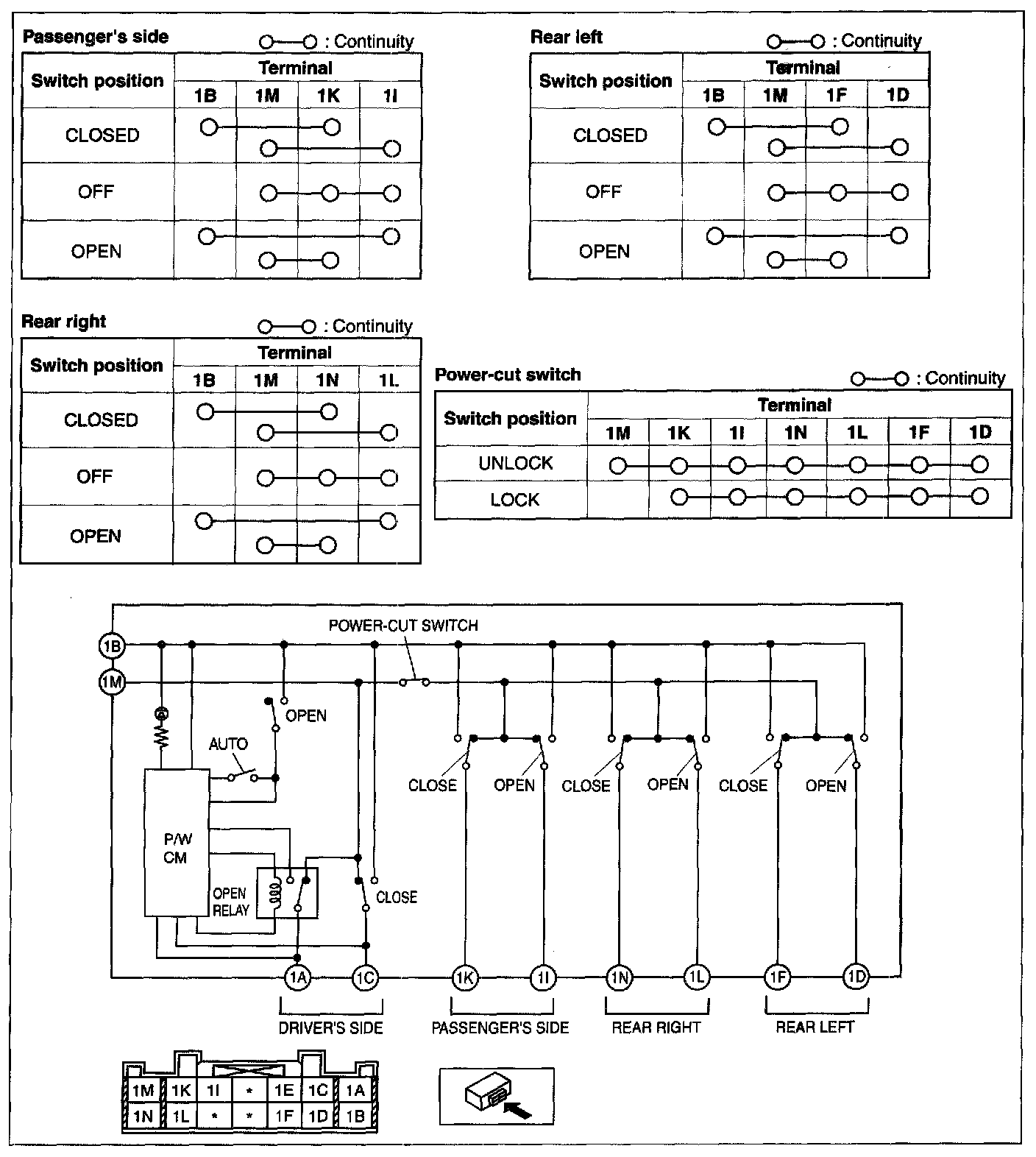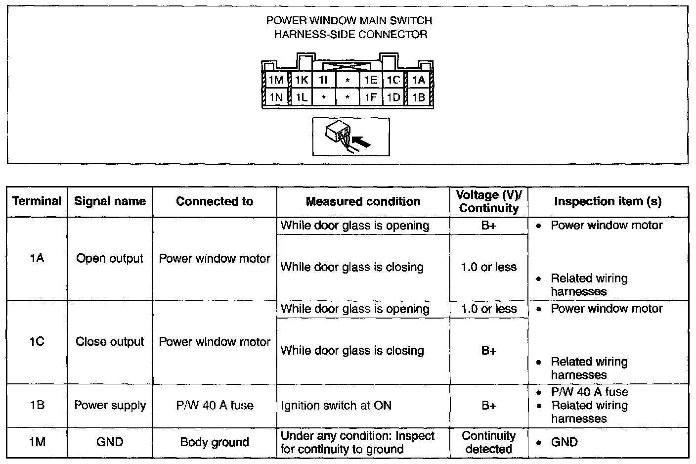 4. Inspect the power window main switch connector for continuity at terminal 1M.