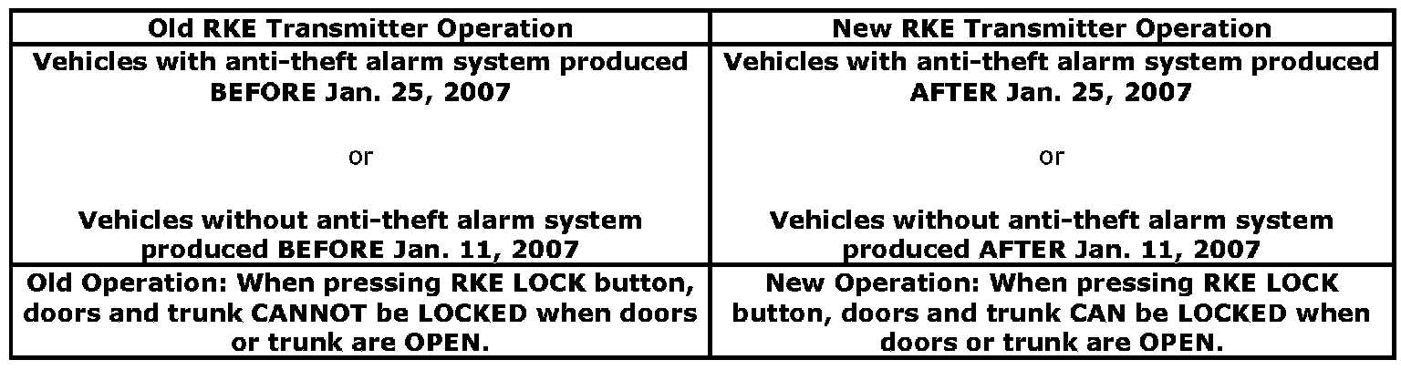 The Remote Keyless Entry (RKE) system transmitter locking specifications for the doors and trunk have been changed as shown.
