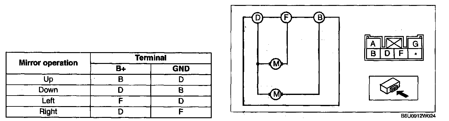 2. Apply battery positive voltage to the power outer mirror terminals, and inspect the operation of the power outer mirror.