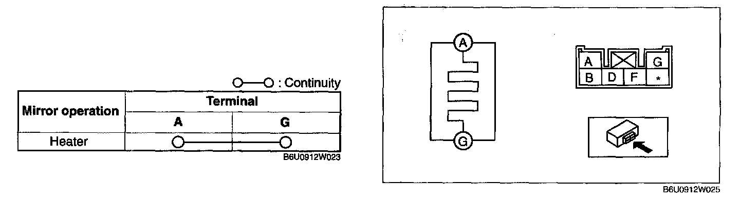 3. Inspect for continuity between the power outer mirror heater terminals.