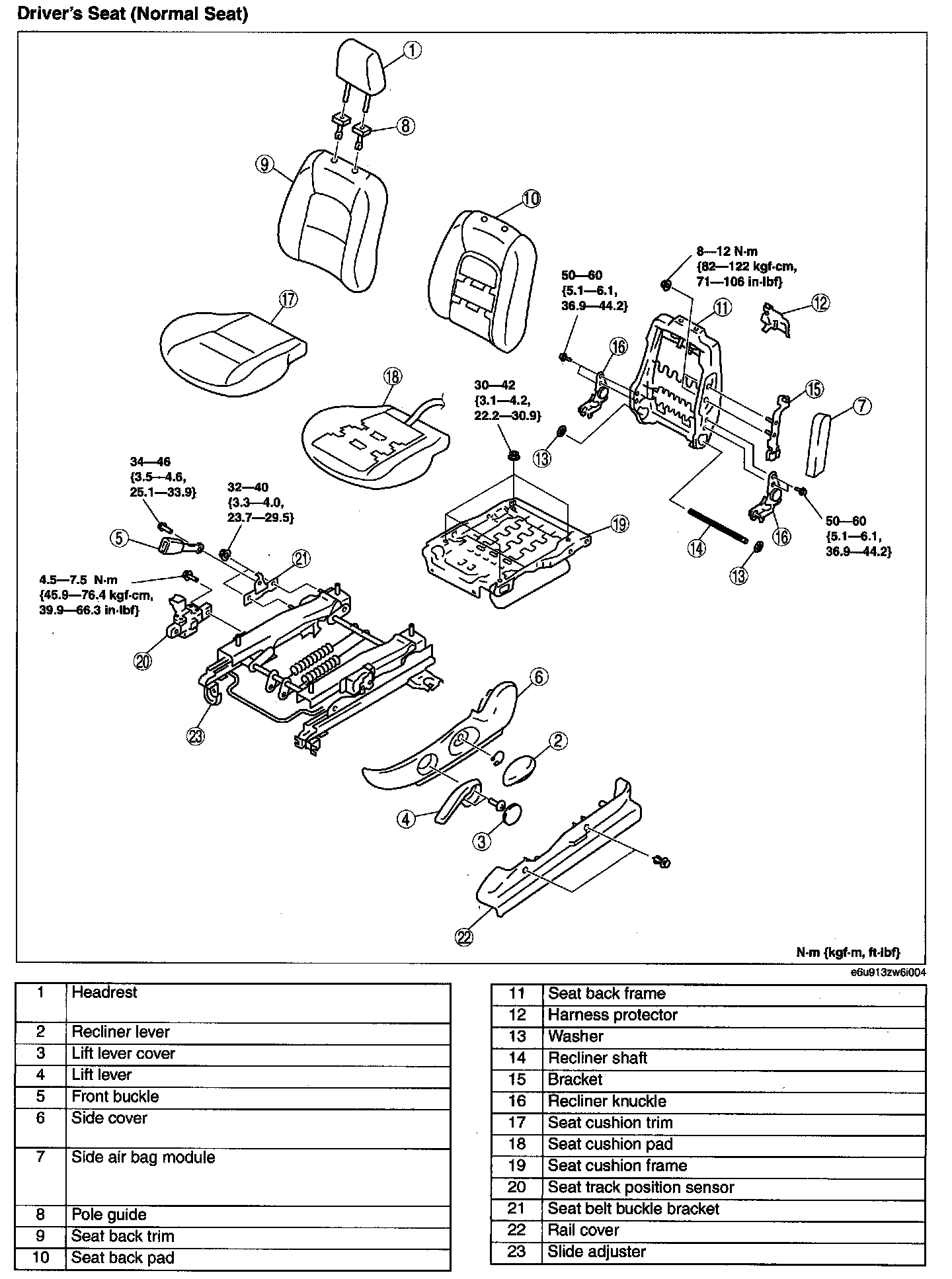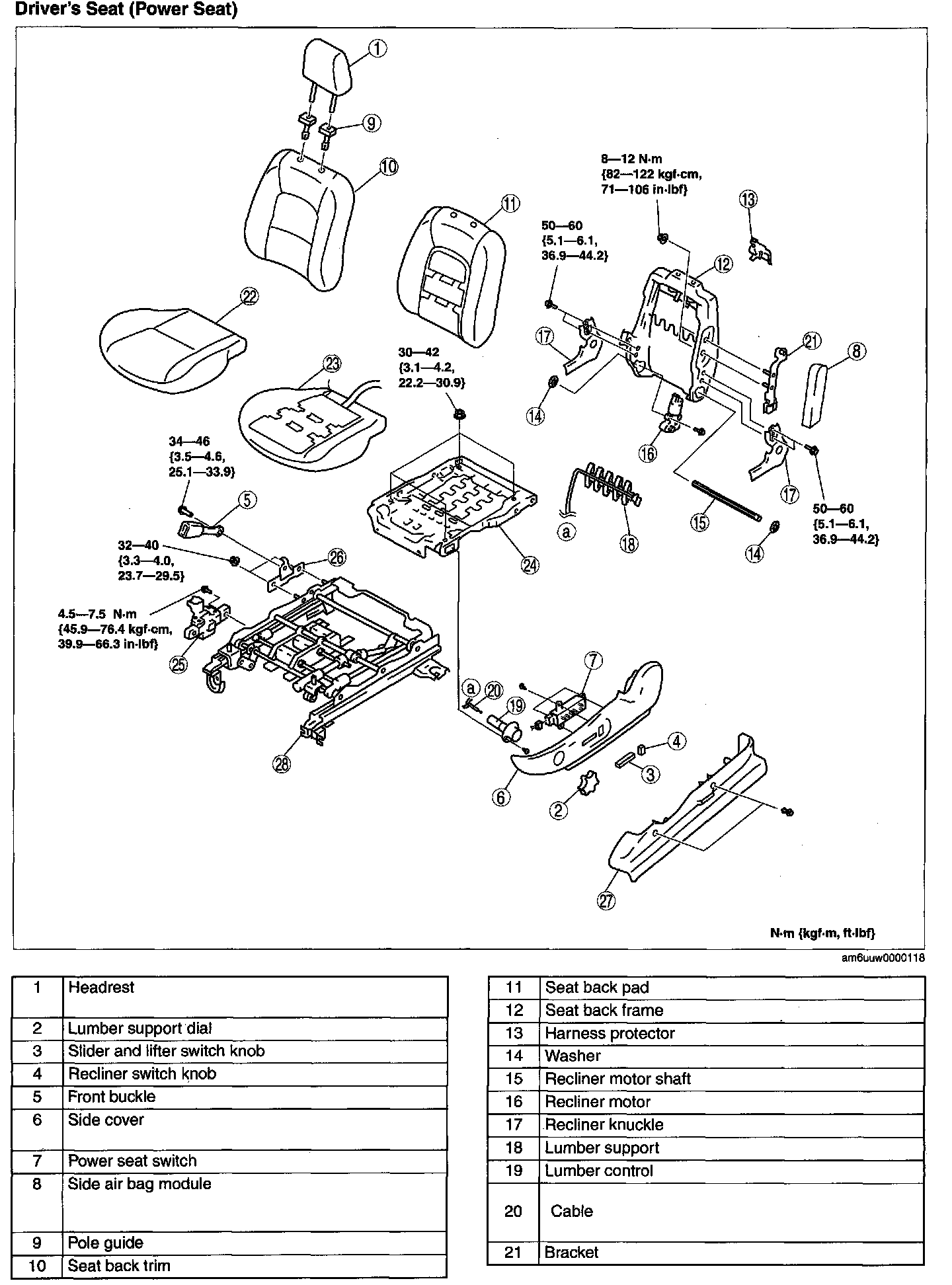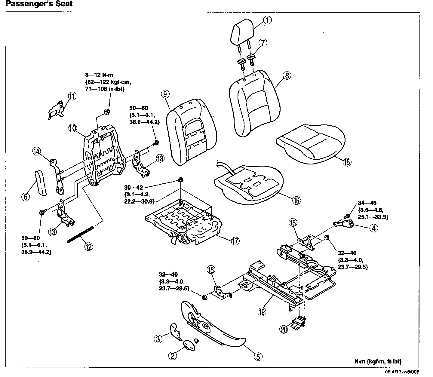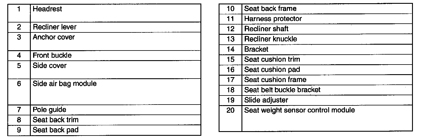 FRONT SEAT DISASSEMBLY/ASSEMBLY [EXCEPT L3 WITH TC]WARNING: Handling the front seat (with a side air bag) improperly can accidentally deploy the side air bag, which may seriously injure you. Read air bag system service warnings and cautions before handling the front seat (with a side air bag).
