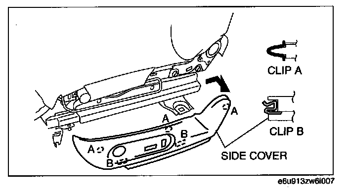 1. Remove the pins A and clips B from the side cover using a tape-wrapped flathead screwdriver.