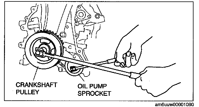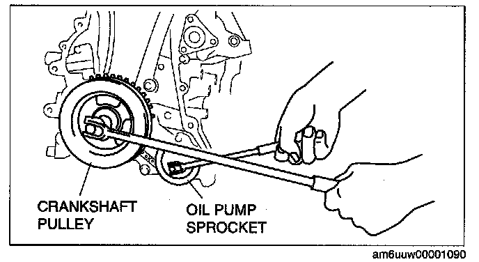2. Install the oil pump sprocket, and then remove the crankshaft pulley and crankshaft pulley lock bolt.