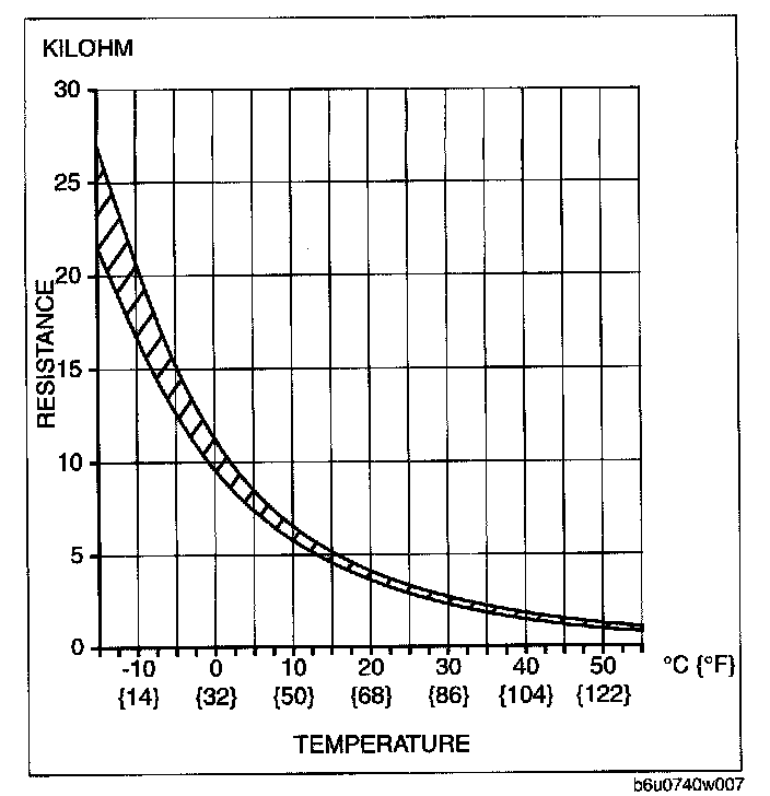 - If the resistance is not as shown in the graph, replace the water temperature sensor.