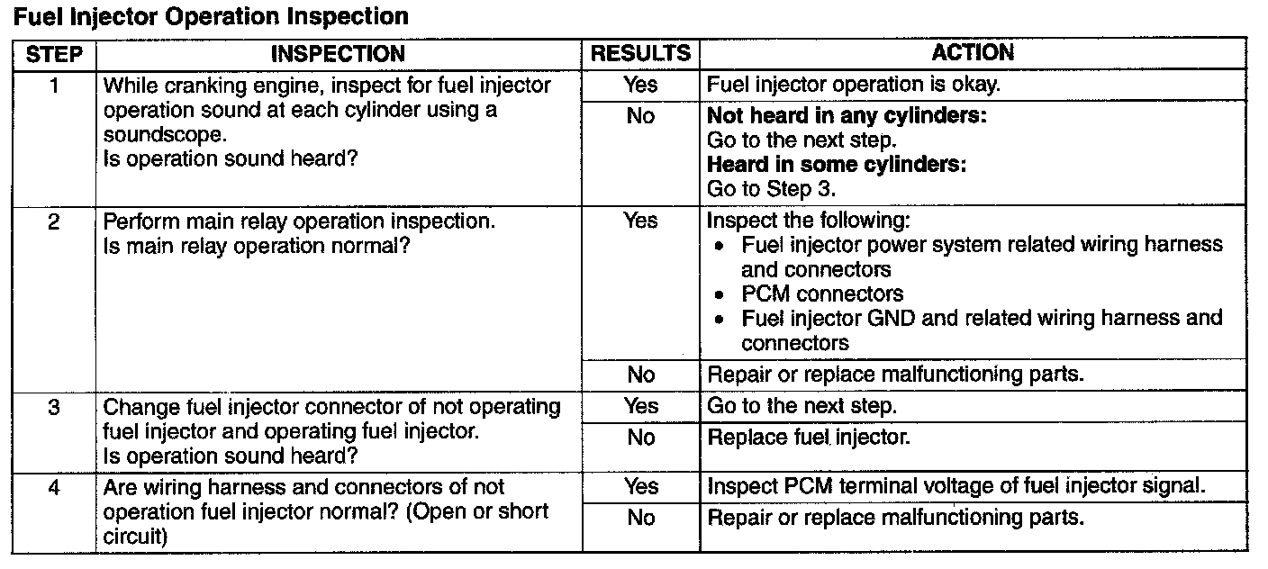 5. Listen for the fuel injector operation sound at all cylinders using the sound scope and monitor both PIDs while performing the following steps: