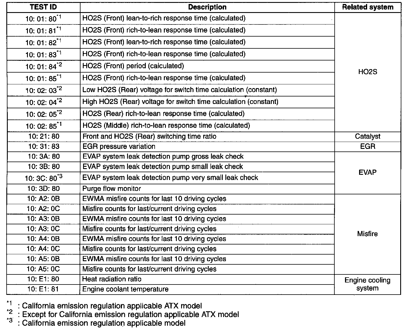 DIAGNOSTIC MONITORING TEST RESULTS[L3]- The purpose of this test mode is to confirm the result of OBD-II monitor diagnostic test results. The result values stored when particular monitor is completed are displayed. If the monitor is not completed, initial value is displayed.