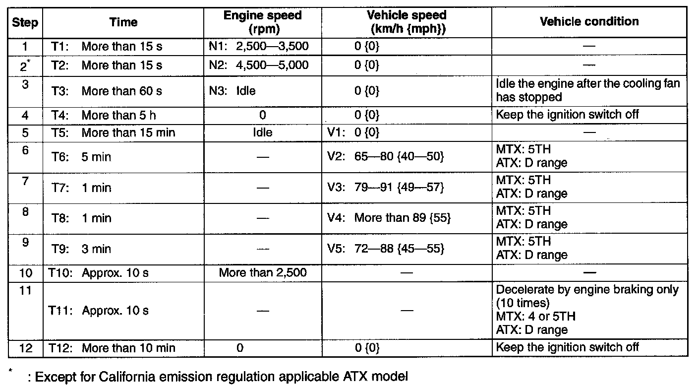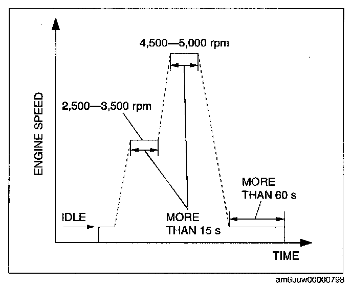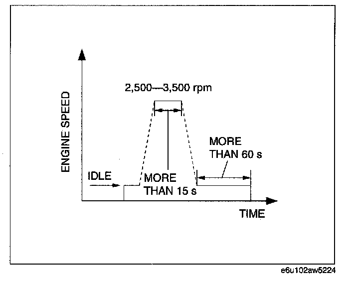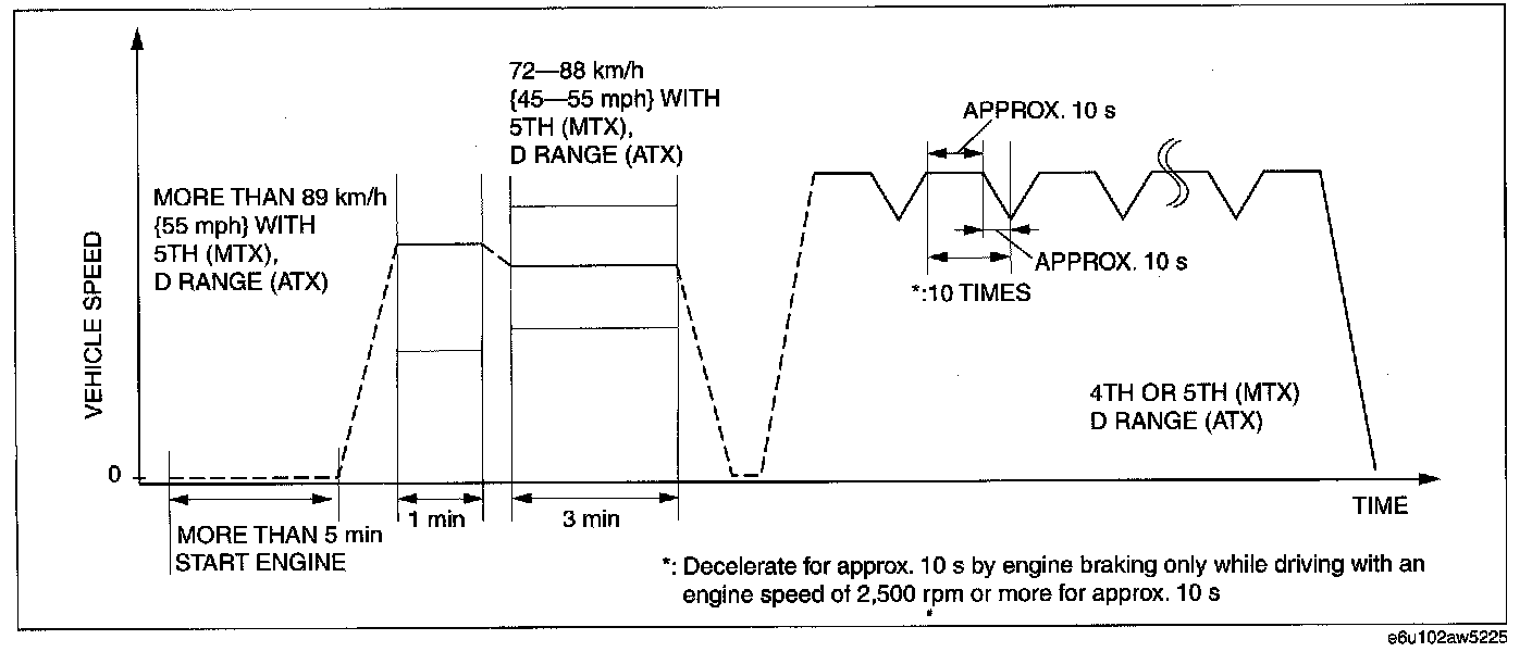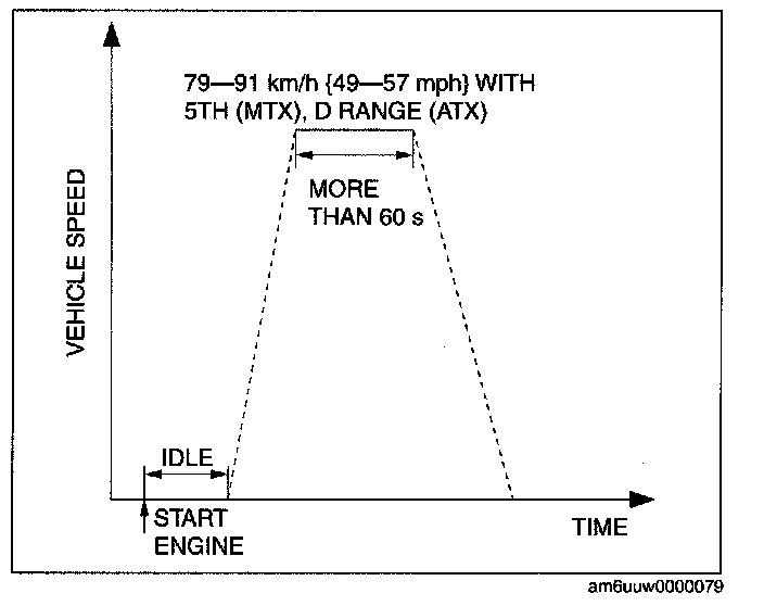 6. Drive the vehicle at an engine speed of 65-80 km/h {4O-50 mph} for more than 5 mm.