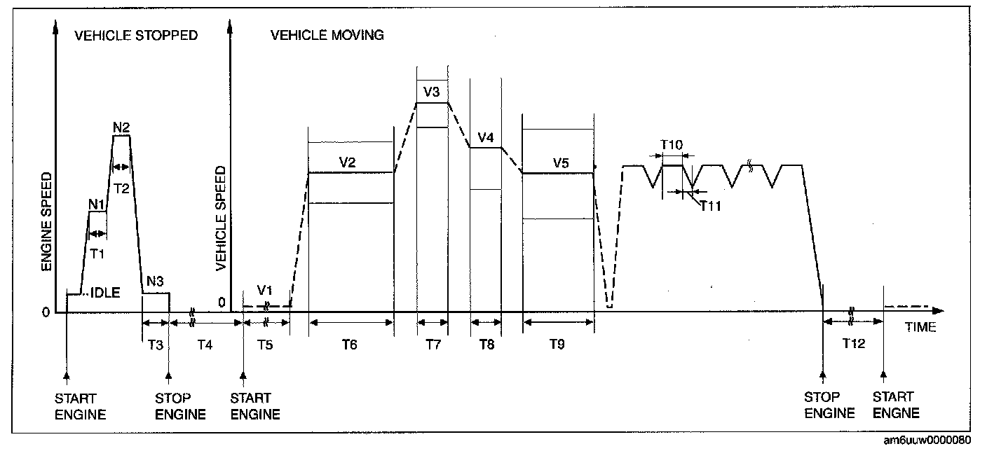 5. With the vehicle stopped, race the engine at the engine speed indicated, and then drive the vehicle as shown in the graph. The driving conditions before driving at constant speed are not specified. If possible, monitor RPM PID for engine speed during this procedure.