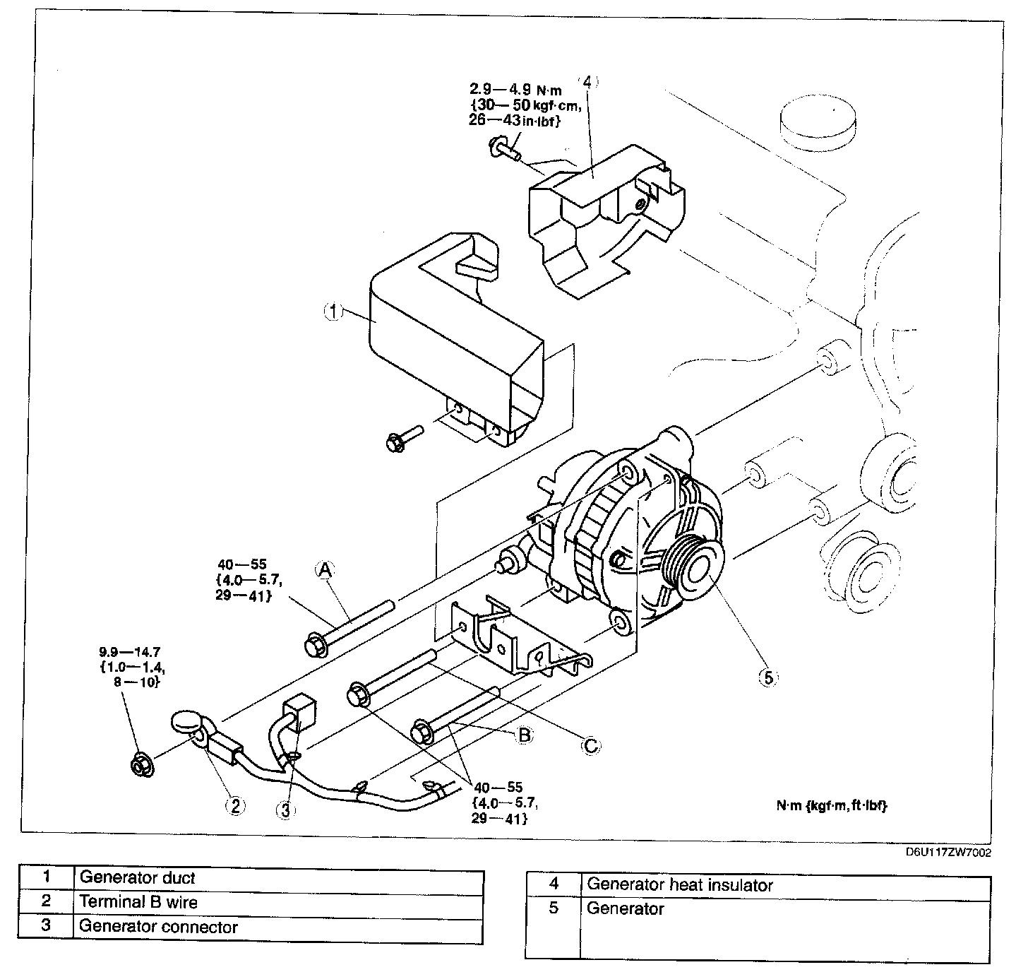 GENERATOR REMOVAL/INSTALLATIONWARNING: When the battery cables are connected, touching the vehicle body with generator terminal B generates sparks. This can cause personal injury, fire, and damage to the electrical components. Always disconnect the battery before performing the following operation.