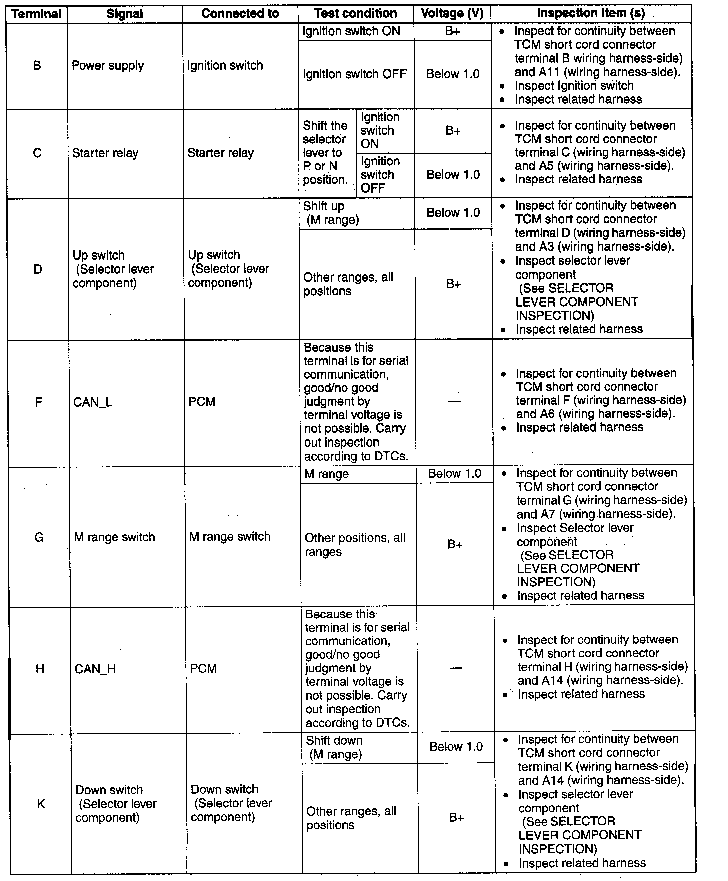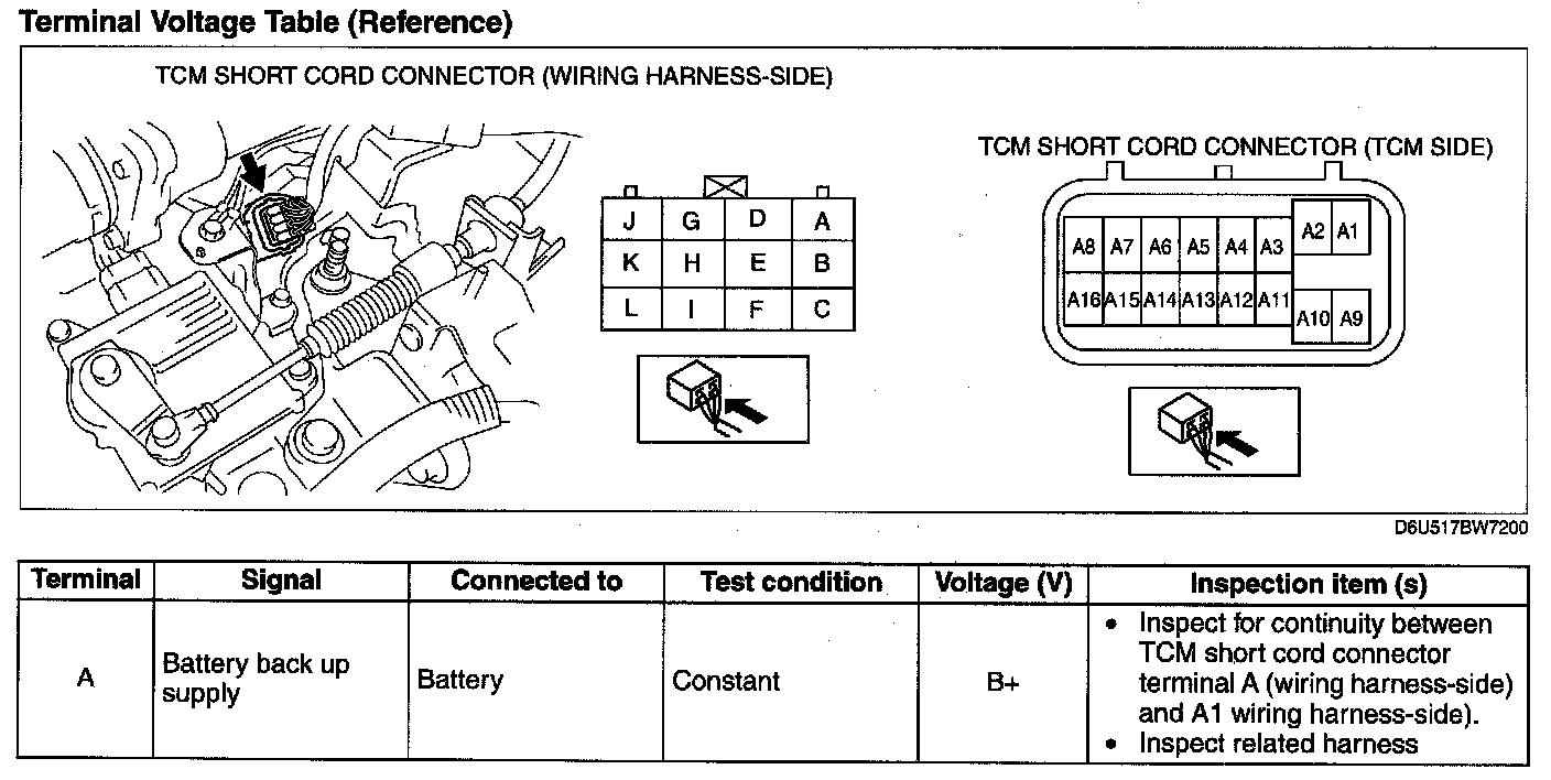 2. Measure the voltage at each TCM short cord connector wiring harness-side) terminal and refer to the terminal voltage table.