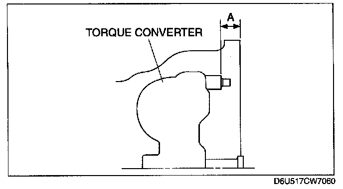 6. To ensure that the torque converter is installed accurately, measure distance A between the end of the torque converter and the end of the converter housing.