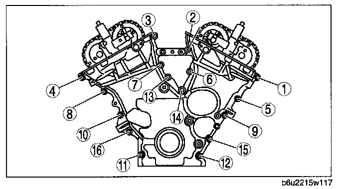 5. Tighten the bearing caps evenly in the order shown in several passes.