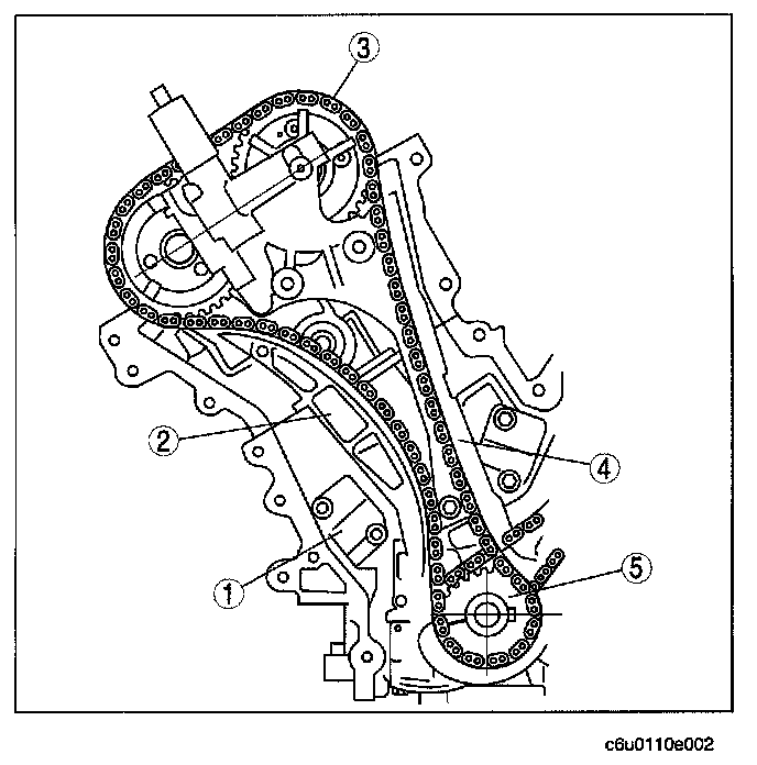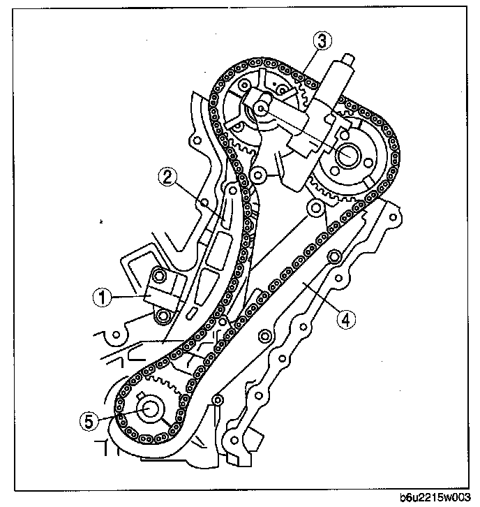 ^ If timing marks in the timing chains are not evident, use a permanent-type marker to mark the crankshaft and camshaft timing marks on the timing chain.