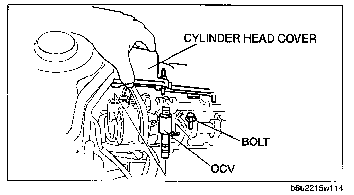 2. Remove the oil control valve (OCV) with cylinder head cover raised as shown in the figure.