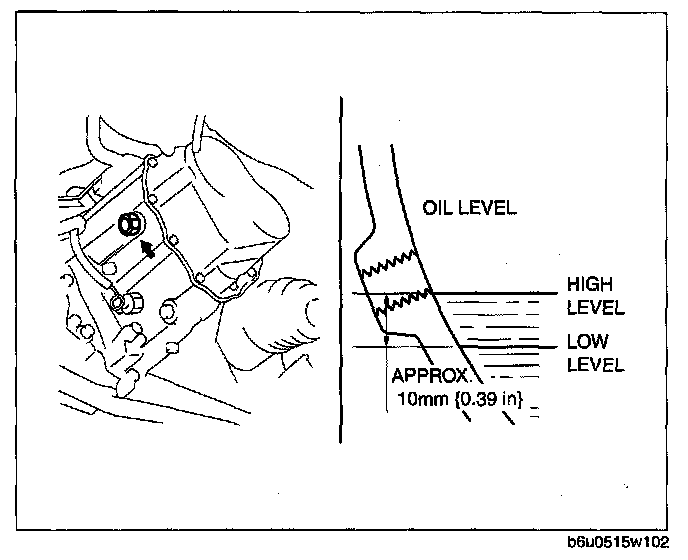 ^ If the oil level is lower than the low level, add the specified amount and type of oil through the oil level plug hole.
