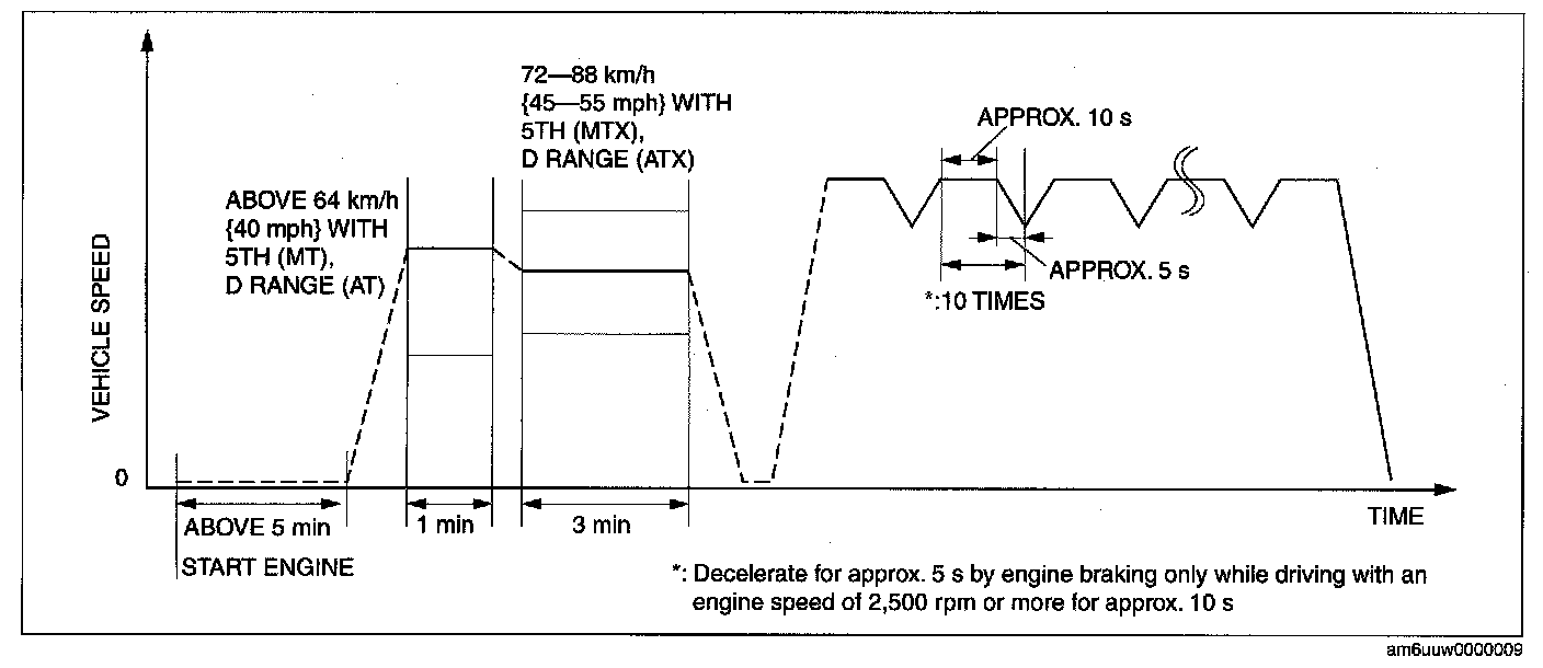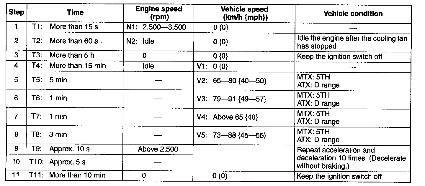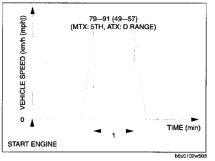 6. Drive the vehicle at the engine speed of 65-80 km/h {40-50 mph) for 5 mm or more.