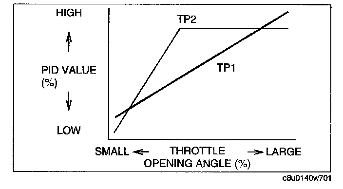 6. Operate the accelerator pedal and verity that the TP1 or TP2 PID (percentage) changes as shown in the following graph.