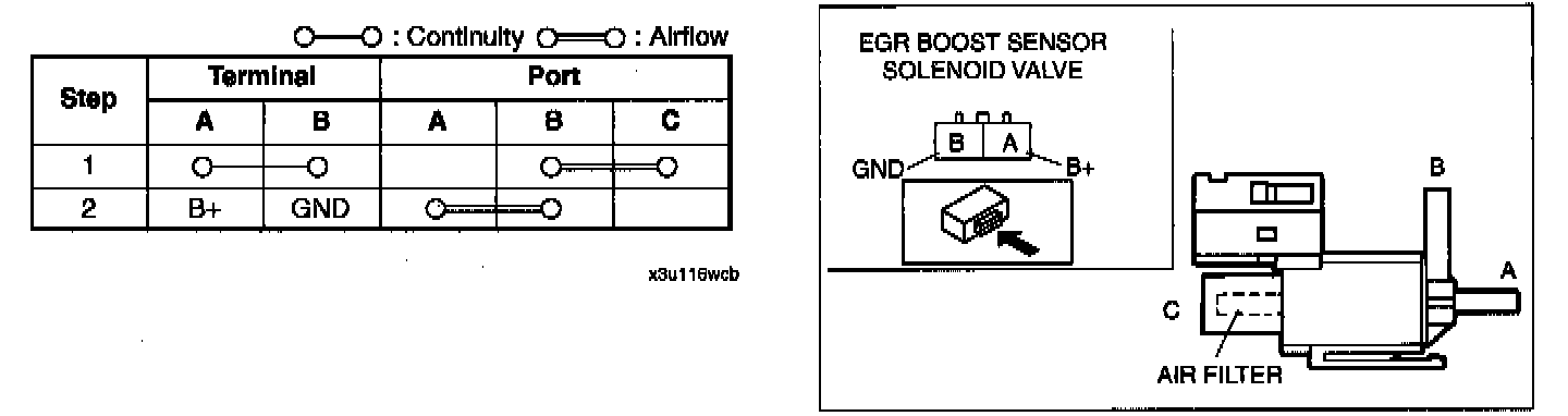- EGR boost sensor solenoid valve terminal B and body ground.