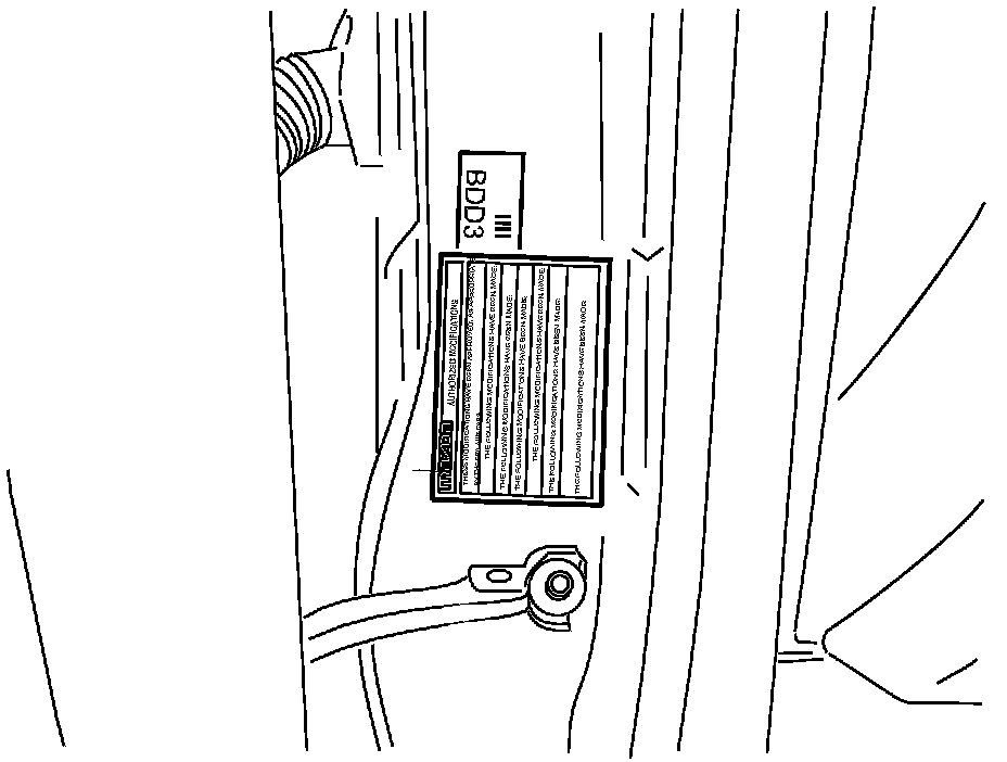 5. Place the "Authorized Modifications" label on the "A" pillar below the tear tag in the driver doorjamb. The "Authorized Modification" label will inform technicians of the PCM calibration change if future repairs are necessary.