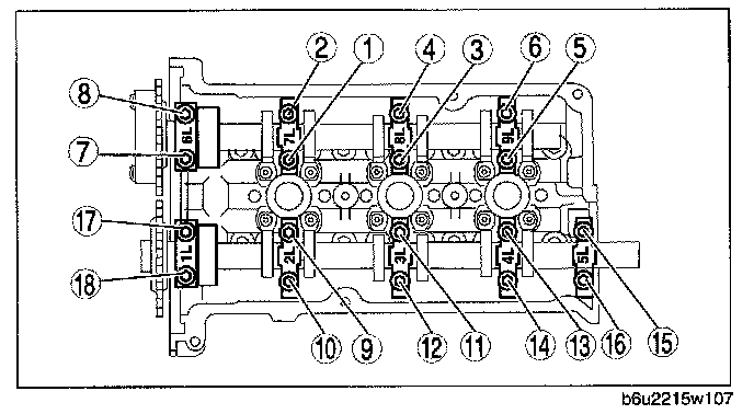 After adjusting the camshaft end play using the thrust caps 1L and 6L, tighten the other bearing caps.